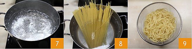 Maintenant, occupez-vous des pâtes : mettez sur le feu une casserole à fond épais adaptée à la cuisson des spaghetti, une fois l'ébullition atteinte 7, ajoutez les spaghetti 8. Faites cuire les pâtes al dente puis égouttez-les 9.