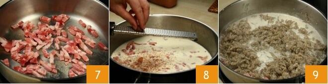Mettez dans une poêle les lardons fumés 7 et faites-les revenir à feu doux pour qu'ils deviennent bien dorés et libèrent une partie de la graisse qu'ils contiennent : une fois dorés, ajoutez la crème fraîche, le poivre moulu 9 et puis, dès que la crème frôle l'ébullition, éteignez le feu.