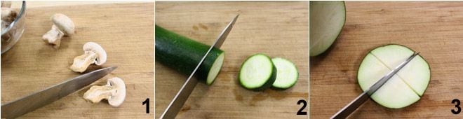 Pour préparer les brochettes de légumes, commencez par nettoyer les champignons et coupez-les en deux 1, lavez tous les légumes et coupez la courgette en rondelles de 1 cm 2, tranchez l'aubergine et divisez chaque tranche en quatre 3, toujours d'une épaisseur de 1 cm ,
