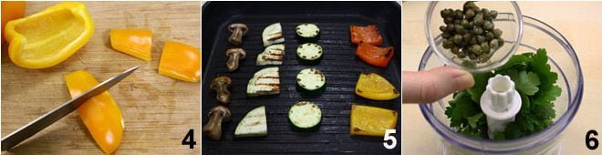 coupez enfin aussi les poivrons en rectangles des mêmes proportions que les autres légumes 4. Badigeonnez d'huile une grande grille et faites cuire à feu vif les légumes 5. Pendant ce temps, préparez la sauce en mettant dans le mixeur les feuilles de persil, les câpres 6, l'huile,