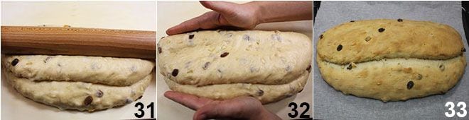 pressez avec le rouleau à pâtisserie au centre, pour bien sceller et donner au stollen sa forme classique 31. Modelez un peu avec les mains pour donner au stollen une forme régulière 32 et placez-le sur une plaque recouverte de papier sulfurisé. Enfournez dans un four statique déjà chaud à 180° pour environ 60-70 minutes, jusqu'à ce que le stollen soit ambré 33.