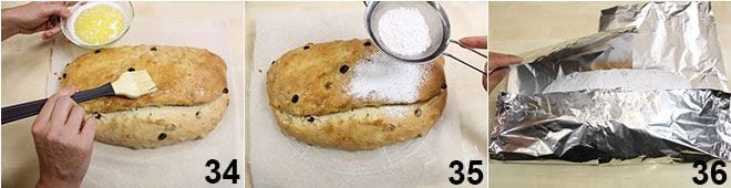 Une fois sorti du four, badigeonnez-le immédiatement avec le beurre fondu 34 et saupoudrez-le de beaucoup de sucre glace tamisé 35, puis laissez-le refroidir sur une grille. Enveloppez-le ensuite dans du papier d'aluminium et laissez reposer le stollen dans un endroit frais (mais pas au réfrigérateur) pendant quelques jours avant de le consommer, de manière à ce qu'il absorbe l'humidité et atteigne la consistance classique. Bon Stollen et Joyeux Noël à tous !!