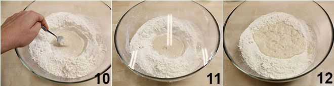 Mélangez avec une cuillère en incorporant à la levure un peu de farine, jusqu'à obtenir un mélange semblable à une pâte, que vous laisserez ainsi au centre sans pétrir 10. Couvrez le tout avec un film plastique 11 et laissez lever pendant au moins une demi-heure dans un endroit tiède, jusqu'à ce que le mélange double de volume 12.