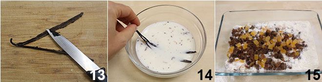 Pendant que la pâte lève, coupez une gousse de vanille en deux et grattez ses graines internes avec la lame d'un petit couteau 13. Mettez la gousse ouverte et les graines en infusion dans un bol contenant le reste du lait que vous aurez tiédi 14. Ensuite, faites fondre le beurre et laissez-le refroidir ; enfin, égouttez les raisins secs et l'orange confite, tapotez-les avec du papier absorbant pour les sécher, passez-les dans la farine 15 puis dans un tamis pour éliminer l'excédent.