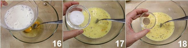 À ce stade, dans un bol, battez les deux œufs et ajoutez le lait dans lequel vous aviez mis la vanille en infusion (en retirant préalablement la gousse) 16. Ajoutez le sel et la cardamome 18 et enfin