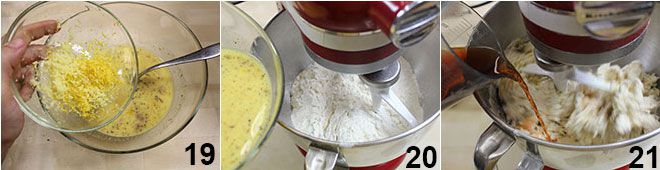 le zeste de citron et le gingembre râpés 19. Versez le mélange de levure et de farine dans le bol d'un batteur (ou dans un grand bol si vous pétrissez à la main) et activez la machine équipée d'une feuille (vitesse lente). Versez à l'intérieur du bol le mélange d'œufs et de lait 20 puis 50 ml supplémentaires de rhum 21 et le sucre.
