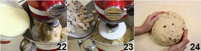 Enfin, ajoutez le beurre fondu tiède petit à petit 22. Dès que les ingrédients seront incorporés, retirez la feuille et mettez le crochet, puis pétrissez pendant environ 10 minutes jusqu'à ce que la pâte soit homogène et complètement accrochée au crochet. Ajoutez les amandes hachées (froides), puis les raisins secs et l'orange confite farinée 23 et pétrissez pendant quelques minutes. Mettez la pâte sur un plan de travail, donnez-lui une forme ronde 24.