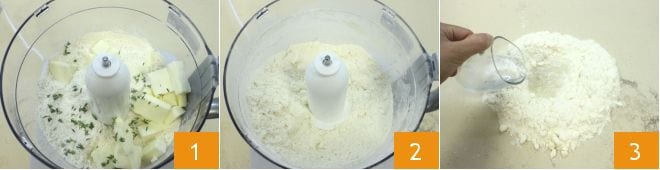 Pour préparer le strudel aux cèpes, commencez par la pâte brisée : versez dans un mixeur la farine, le beurre froid coupé en morceaux, une pincée de sel et les feuilles de thym 1. Mixez pendant quelques secondes, jusqu'à obtenir une texture sableuse 2. À ce stade, transférez le mélange sur un plan de travail propre et formez une fontaine au centre. Commencez à pétrir en versant l'eau petit à petit 3.