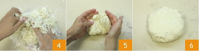 Continuez à pétrir à la main 4, jusqu'à obtenir une pâte compacte 5, donnez-lui une forme ronde 6, puis enveloppez la pâte brisée de film plastique et laissez reposer au réfrigérateur pendant 40 minutes. Pour découvrir comment préparer et conserver au mieux la pâte brisée, vous pouvez consulter notre recette ici.