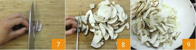 Pendant ce temps, préparez la garniture du strudel : épluchez l'échalote, posez-la sur une planche et émincez-la finement 7. Maintenant, occupez-vous du nettoyage et de la découpe des cèpes, pour effectuer cette opération correctement, consultez l'École de cuisine : Comment nettoyer les cèpes. Une fois nettoyés et lavés, tranchez-les 8. Ensuite, versez un filet d'huile dans une poêle antiadhésive et faites revenir l'échalote, puis ajoutez les cèpes 9.