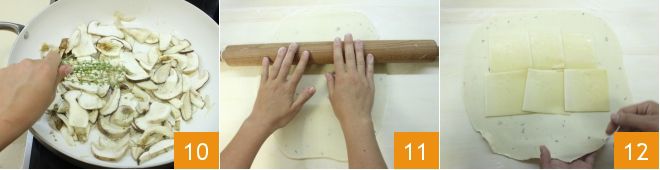 Terminez en ajoutant des feuilles de thym 10 et laissez cuire à couvert pendant environ 20 minutes, jusqu'à ce que les champignons soient légèrement flétris et dorés. Éteignez le feu et laissez refroidir. Sortez la pâte brisée du réfrigérateur, retirez le film plastique et commencez à l'étaler avec un rouleau à pâtisserie, en essayant de former un rectangle d'environ 40x50 cm 11 avec une épaisseur de 1/2 cm. Une fois la pâte étalée, formez une première couche de tranches d'emmental 12.