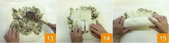 Versez sur la couche de fromage également les cèpes cuits 13 et terminez par une autre couche de tranches d'emmental 14. Ensuite, roulez délicatement la pâte brisée : prenez la pâte d'un des côtés les plus longs et repliez-la vers l'intérieur, en veillant à ne pas faire sortir la garniture 15 et fermez en paquet les deux extrémités.