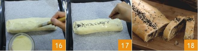 Recouvrez une plaque de cuisson de papier sulfurisé et placez au centre le strudel avec l'emmental et les cèpes, puis battez un œuf dans un bol, ajoutez une cuillère à soupe de lait et, à l'aide d'un pinceau de cuisine, lustrez la surface du strudel 16. Saupoudrez de graines de pavot 17 et enfournez dans un four statique préchauffé à 180° pendant 45 minutes ; si vous utilisez un four à convection, cuisez à 160° pendant 35-40 minutes. Après ce temps, sortez le strudel avec emmental et cèpes et laissez-le tiédir sur une grille, puis coupez-le en tranches 18 et servez-le en entrée !