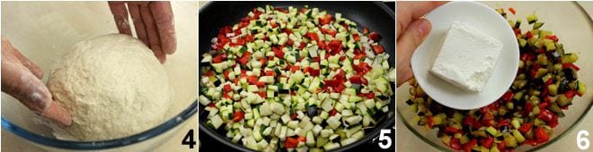 Entre-temps, lavez bien les légumes et coupez-les en dés, puis mettez-les dans une poêle antiadhésive avec deux cuillères à soupe d'huile 5, faites-les cuire et ramollir, salez et poivrez. Mettez les légumes dans un bol et laissez-les tiédir, puis ajoutez la robiola 6,