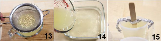 Pour préparer les sucettes glacées au citron, commencez par préparer le sirop, en utilisant le même procédé décrit ci-dessus. Pendant que le sirop refroidit, pressez les citrons jusqu'à obtenir 150 g de jus, filtrez-le avec une passoire fine 13 et ajoutez-le au sirop maintenant froid 14. Répétez l'opération du bâtonnet également pour les sucettes glacées au citron, versez le liquide dans les moules 15 en vous rappelant de laisser 1 cm d'espace du bord. Mettez-les au congélateur jusqu'à ce qu'elles aient atteint une consistance solide.