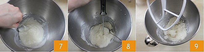 et en mélangeant avec une cuillère, refroidissez-le jusqu'à ce qu'il atteigne une température de 60 degrés (7-8). À ce stade, travaillez-le dans le batteur équipé d'un crochet feuille, jusqu'à obtenir un bloc blanc et compact 9.