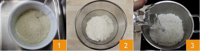 Pour préparer le sushi à l'italienne, commencez par préparer le riz (vous pouvez consulter le procédé en détail dans la fiche du sushi) : nous avons utilisé 250 g de riz cru (avec grains ronds et petits) qui, une fois cuit, doublera son poids. Lavez le riz sous l'eau froide courante 1 : faites au moins une dizaine de rinçages, en remuant le riz avec les mains, jusqu'à ce que l'eau devienne bien claire. Laissez le riz tremper pendant 15 minutes, puis égouttez-le 2 et laissez-le reposer encore 15 minutes dans la passoire. Après ce temps, placez le riz dans une casserole pas trop large et couvrez-le entièrement avec de l'eau. 3.