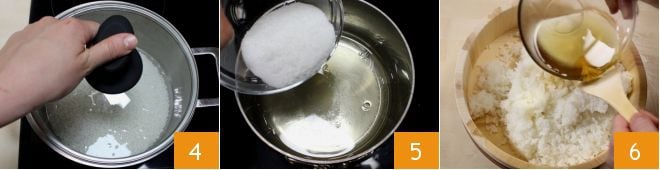 Couvrez le riz avec un couvercle 4, faites cuire à feu moyen pour porter à ébullition. N'ouvrez plus le couvercle jusqu'à ce que vous entendiez l'ébullition. À ce moment-là, faites bouillir pendant 8 à 10 minutes, puis baissez le feu et faites cuire à feu doux pendant encore 8 à 10 minutes. Après ce temps, éteignez le feu et laissez reposer avec le couvercle pendant au moins 10 minutes. Pendant ce temps, préparez l'assaisonnement : versez le vinaigre de riz dans une petite casserole, ajoutez le sucre 5, le sel et chauffez le tout pour dissoudre le sucre en remuant de temps en temps, sans porter à ébullition. Éteignez le feu et laissez refroidir. Lorsque le riz a reposé pendant le temps indiqué, transférez-le dans l'hangiri (ou dans un récipient bas et large), prenez une louche en bois (de préférence le shamoji, spatule plate et arrondie) et, en la tenant au-dessus du riz, versez-y le mélange de vinaigre de riz désormais froid 6, de manière à l'imbiber et à le répartir mieux. Remuez le riz avec la spatule en coupant, pour ne pas l'écraser, et éventez-le en même temps avec une assiette en plastique pour le refroidir rapidement et faire évaporer le vinaigre. Une fois refroidi, couvrez-le avec un torchon propre jusqu'au moment de l'utiliser pour éviter le dessèchement.