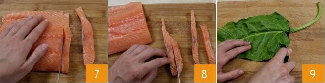 Passez ensuite à la préparation du sushi : lavez sous l'eau courante et séchez avec du papier absorbant le pavé de saumon, déjà sans arêtes (en alternative, vous pouvez utiliser 50 g de saumon et 50 g de thon frais). Ensuite, placez-le sur une planche à découper et découpez des tranches d'environ 1 cm d'épaisseur 7 que vous diviserez ensuite en deux pour créer des lanières 8. Lavez ensuite sous l'eau courante les feuilles de bette une à une. Puis coupez la tige 9.