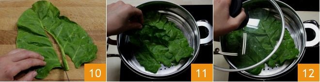 Ensuite, retirez la côte centrale 10. Prenez un cuiseur vapeur et chauffez l'eau, puis ajoutez le panier. Lorsque le panier sera bien chaud, déposez les feuilles de bette 11 et couvrez ensuite avec le couvercle 12 pour cuire les feuilles à la vapeur pendant environ 2 à 3 minutes (si vous n'avez pas de cuiseur vapeur, vous pouvez utiliser une casserole et remplacer le panier par une passoire en aluminium).
