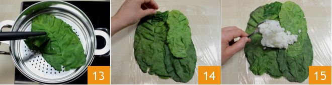 Retournez les feuilles également de l'autre côté à mi-cuisson à l'aide de pinces de cuisine 13 et éteignez ensuite le feu. Sur un plan de travail, placez des rectangles de film plastique, puis avec les feuilles de bette tièdes, formez des carrés d'environ 18 cm de côté 14, en les disposant légèrement superposées. Ensuite, ajoutez environ 120 g de riz au centre 15.
