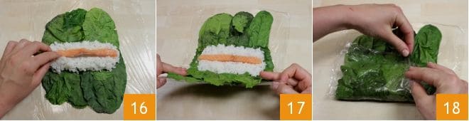 Distribuez le riz au centre des feuilles, créant un rectangle et laissant environ 1 cm d'espace sur les côtés. Placez une lanière de saumon sur le riz 16. Prenez les bords du film plastique et soulevez-les 17 pour replier les feuilles sur le remplissage. Ensuite, retirez le film de la partie repliée, en maintenant les feuilles avec les doigts 18.