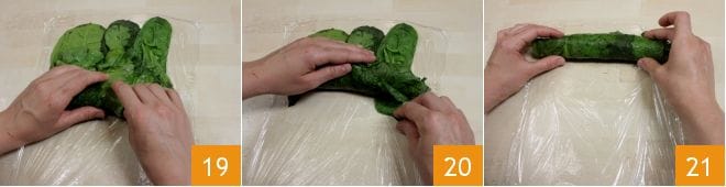 Enroulez délicatement les feuilles en les roulant sur elles-mêmes 19 en pressant bien le riz et en faisant bien adhérer les feuilles entre elles 20 pour obtenir un rouleau compact 21.
