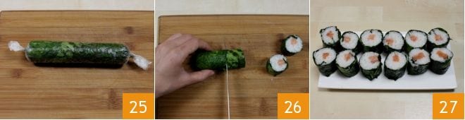 Scellez le film en fermant les bords en forme de bonbon 25 et laissez reposer le sushi ainsi obtenu au réfrigérateur pendant 1 à 2 heures. Une fois le temps indiqué écoulé, retirez le revêtement du film. Avant de couper le sushi, humidifiez la lame du couteau avec l'eau acidulée. C'est parce que le riz cuit est très collant et a tendance à s'accrocher. Ensuite, découpez des rouleaux de 2 cm de longueur 26. Conservez le sushi à l'italienne au réfrigérateur jusqu'au moment de servir. Vous pouvez présenter le sushi à l'italienne sur un plat de service 27 et l'accompagner de sauce soja ou de gingembre mariné !
