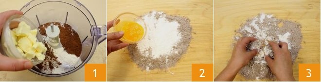 Dans un mixeur, mettez la farine tamisée, le cacao, et enfin le beurre froid coupé en dés 1. Mixez le tout jusqu'à obtenir un mélange sableux et farineux. Transférez-le sur un plan de travail en lui donnant la forme classique d'une fontaine, ajoutez ensuite le sucre glace et les jaunes d'œufs battus 2. Procédez en pétrissant énergiquement avec les mains 3.