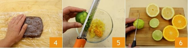 Râpez le zeste de l'orange, du citron et des citrons verts 5, puis coupez-les en deux 6.