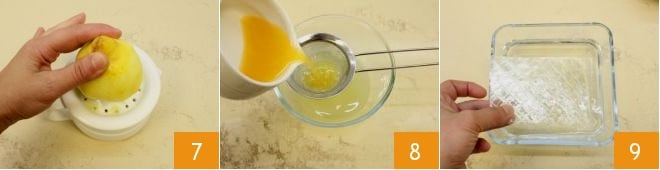Pressez tous les agrumes 7 et à ce stade, filtrez le mélange de jus avec une passoire 8. Mettez-le de côté et poursuivez avec la cuisson du curd. Mettez la gélatine à tremper dans un peu d'eau froide pour la ramollir 9.