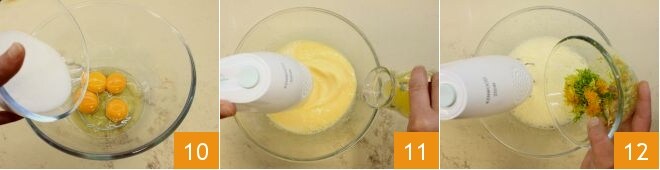 Dans un grand bol, mettez les jaunes d'œufs, les œufs entiers et le sucre 10 et avec l'aide d'un batteur électrique, fouettez jusqu'à obtenir un mélange clair et mousseux. À ce stade, ajoutez en filet les jus d'agrumes 11 et leurs zestes râpés 12, en continuant à fouetter pour bien amalgamer les ingrédients.