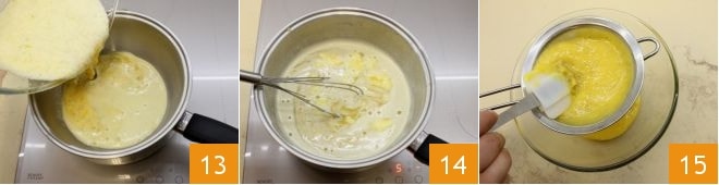 Transférez maintenant tout dans une petite casserole pour cuire le curd au bain-marie 13 : si vous n'avez pas l'ustensile approprié, mettez dans une casserole remplie avec un peu d'eau le bol avec le mélange, de manière à ce que le fond ne touche pas l'eau. Faites cuire à feu doux pendant 2-3 minutes en remuant avec un fouet, puis ajoutez le beurre en morceaux 14 et continuez à cuire pendant 10 minutes supplémentaires jusqu'à obtenir une crème épaisse que vous devez filtrer avec une passoire, en vous aidant d'une maryse 15.