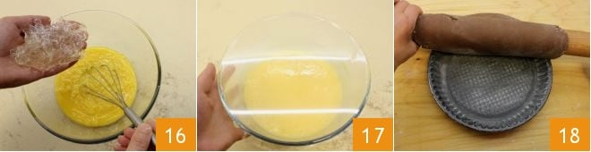 Égouttez la gélatine et pressez-la bien, puis ajoutez-la à la crème et faites-la fondre en remuant soigneusement et longtemps 16. Si nécessaire, filtrez-la à nouveau. Couvrez la crème avec du film plastique 17 et laissez-la refroidir au réfrigérateur pendant au moins 1 heure. Pendant ce temps, cuisez la base de la tarte : disposez le petit pain de pâte sablée sur un plan de travail légèrement fariné et étalez-la avec un rouleau à pâtisserie à une épaisseur très fine, environ 5 mm, puis enroulez-la autour du rouleau fariné et déposez-la sur un moule de 24 cm préalablement beurré et fariné 18.