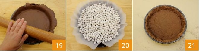 Avec l'aide du rouleau à pâtisserie, éliminez l'excédent de pâte des bords 19, puis tapissez la base avec du papier sulfurisé et placez dessus les billes de cuisson appropriées (si vous n'en avez pas, vous pouvez utiliser des légumineuses sèches) 20. Enfournez dans un four statique préchauffé à 170° pendant 40 minutes (si ventilé, à 150° pendant 20 minutes) et, une fois cuite, laissez la tarte refroidir dans le moule 21.