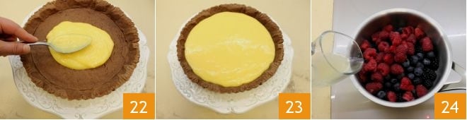 Quand le curd aux agrumes est également prêt, garnissez-en la tarte 22 en la remplissant jusqu'à quelques millimètres des bords et placez-la au réfrigérateur pendant 2 heures pour qu'elle se raffermisse 23. Vous pouvez préparer le coulis entre-temps. Mettez la gélatine à tremper dans un peu d'eau froide.