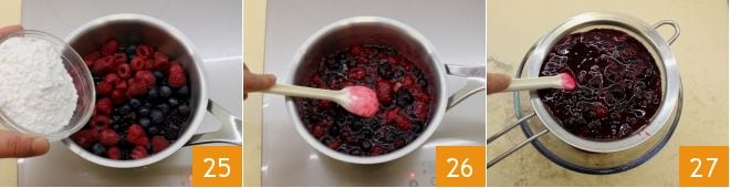 Ajoutez le sucre glace 25, mélangez jusqu'à ce que tout soit bien amalgamé, puis laissez cuire encore une minute à feu doux 26. Filtrez le mélange obtenu avec une passoire pour éliminer d'éventuels pépins : pressez bien les fruits avec le dos d'une cuillère et recueillez la sauce dans un petit bol 27.