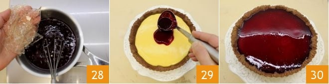 Transférez la sauce dans une petite casserole et ajoutez la gélatine prélevée de l'eau et bien essorée, puis faites-la dissoudre à feu doux, en remuant le mélange pendant 5 minutes 28. Éteignez le feu et prélevez la tarte garnie du réfrigérateur. Versez le coulis chaud sur la surface, en vous aidant d'une louche 29 et en le dosant de manière à ce qu'il ne déborde pas du gâteau 30. Remettez le dessert au réfrigérateur pendant au moins 2 heures supplémentaires.
