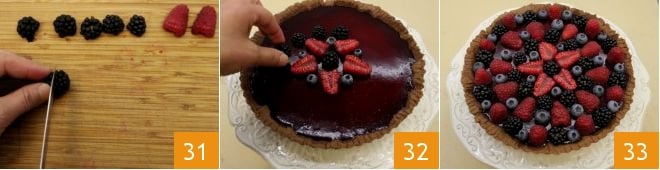 Le temps écoulé, vous pouvez terminer avec la décoration : coupez les fruits rouges 31 et disposez-les à votre guise sur le gâteau 32.