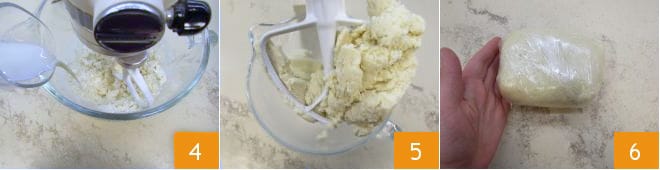 Actionnez la machine et travaillez le mélange avec la feuille en ajoutant le lait en filet 4. Une fois que vous avez obtenu un mélange homogène 5, transférez-le sur un plan de travail et travaillez-le à nouveau juste le temps de lui donner la forme d'un bloc (s'il est trop collant, ajoutez un peu de farine), puis enveloppez-le dans du film alimentaire 6 et laissez-le reposer au réfrigérateur pendant au moins 30 minutes.