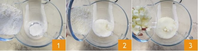 Pour préparer la tarte au chou-fleur, commencez par réaliser la pâte brisée salée. Versez dans le bol d'un robot pâtissier la farine 1, le Pecorino et le Grana Padano 2. Ajoutez ensuite le beurre en dés froid du réfrigérateur 3, une pincée de sel et de poivre.