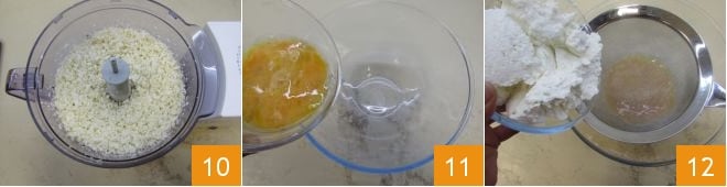 et actionnez-le jusqu'à ce qu'elles soient finement hachées 10. Versez dans un bol les œufs légèrement battus 11, placez une passoire au-dessus et ajoutez la ricotta à l'intérieur 12.