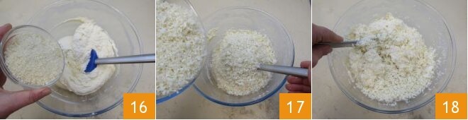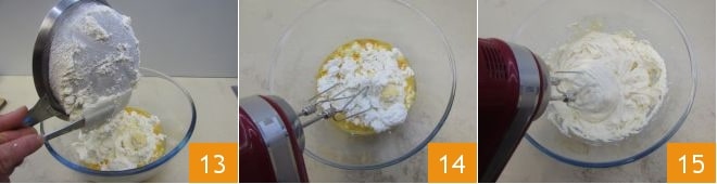 Aidez-vous d'une spatule pour tamiser la ricotta 13, puis travaillez le mélange avec un batteur électrique 14 pendant quelques minutes pour obtenir une crème lisse et homogène 15.
