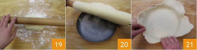 Reprenez votre pâte brisée salée et étalez-la avec un rouleau à pâtisserie sur un plan légèrement fariné. Une fois que vous avez atteint une épaisseur de 5-6 mm, enroulez la pâte autour du rouleau et transférez-la dans un moule de 24 cm préalablement beurré et fariné 20. Aidez-vous de vos mains pour bien ajuster la pâte de manière à ce qu'elle adhère aux bords du moule 21