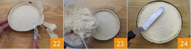 et découpez l'excédent avec un couteau 22. À ce point, versez la garniture à l'intérieur 23 et nivelez-la avec une spatule 24. Faites cuire dans un four statique préchauffé à 200°C pendant 40 minutes. Vous pouvez essayer de cuire dans un four ventilé à 180°C pendant environ 30-35 minutes (vous pouvez faire le test du cure-dent et si vous voyez que la tarte noircit trop en surface, couvrez avec une feuille de papier aluminium); puis sortez la tarte du four