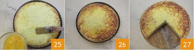 et badigeonnez la surface de la tarte avec un jaune d'œuf préalablement battu 25. Enfournez à nouveau à 200°C pour 10 minutes supplémentaires, puis laissez tiédir votre tarte au chou-fleur avant de la démouler 26 et de la servir 27.
