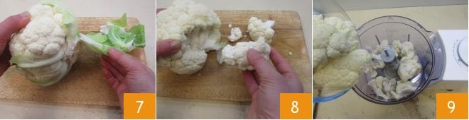 Entre-temps, occupez-vous du chou-fleur : enlevez les feuilles vertes 7, la tige et séparez les fleurettes 8. Puis placez-les dans un mixeur 9