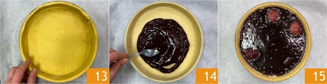 Utilise le disque et les bandes pour foncer respectivement le fond et les bords d'un moule de même taille (diamètre 24 cm, hauteur 3 cm), puis élimine l'excédent de pâte sablée 13. Étale une couche de confiture de mûres sur le fond, en faisant attention à ne pas salir les bords 14. Fais cuire au four statique préchauffé à 175°C pendant environ 20 minutes. Lorsque la pâte sablée est dorée, sors et laisse refroidir 15.