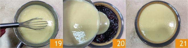 Mélange bien avec un fouet pour le faire fondre complètement 19. Reprends la tarte et verse la ganache sur la couche de confiture 20, puis place au réfrigérateur pendant une heure ou au congélateur pendant 15-20 minutes 21.