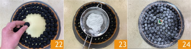 Après le temps de durcissement, garnis la tarte en disposant les mûres fraîches en cercles concentriques jusqu'à couvrir toute la ganache 22, puis saupoudre de sucre glace 23. Ta tarte aux mûres avec ganache blanche est prête à être servie 24 !